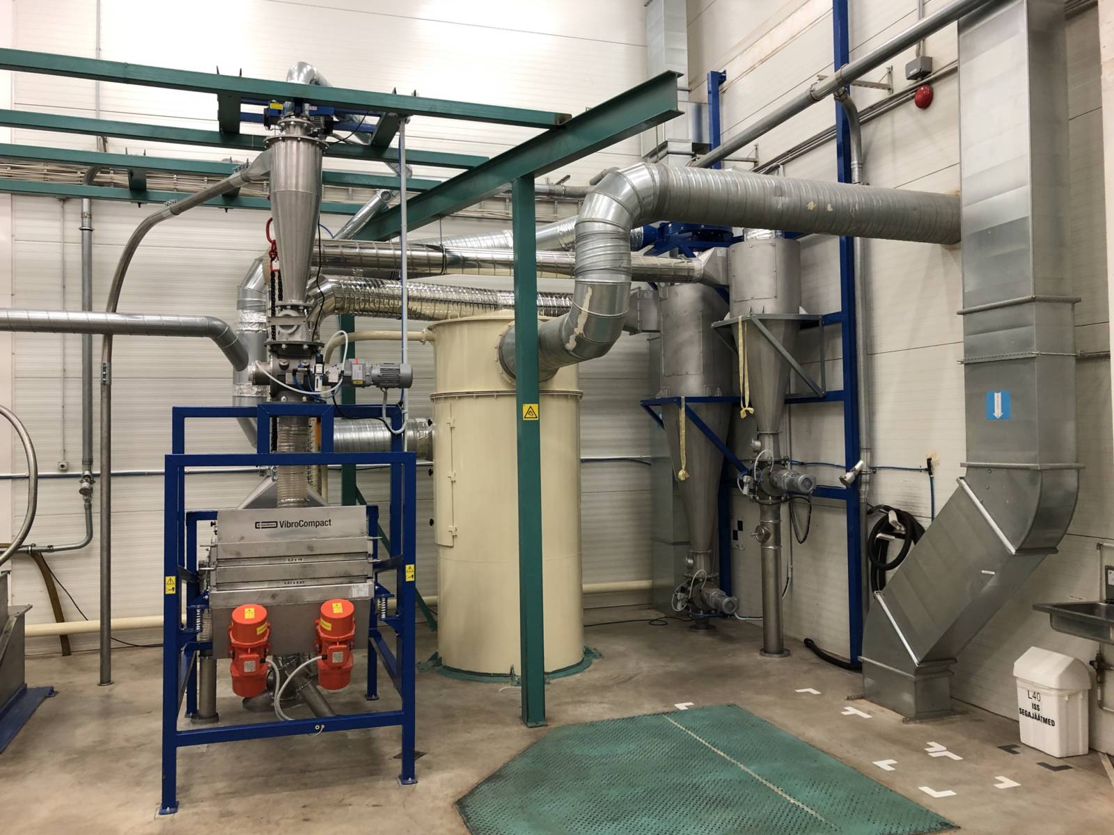 Материал очищается с помощью специально разработанного ситового сепаратора JCC 08, который отделяет большие и мелкие пимеси. Основная очищенная фракция очищается при помощи аспирации JAA 08. Для отстранения тяжелых примесей (камней) применен специально измененный камнеотборник JGD 05. Воздух с аспирации с материалом поступает в циклон JVC 630 с камнеотборника а для JCC 08 применяется циклон JVC 550. С обоих циклоном материал может быть использован в дальнейшей переработке. Материал транспортируется при помощи пневматических транспортеров, чтобы транспортировать материалы различной плотности в диапазоне от 40 до 650 кг / м3. Весь воздух окончательно очищается в фильтрующем устройстве, где удаляется 99,9% мелких частиц.